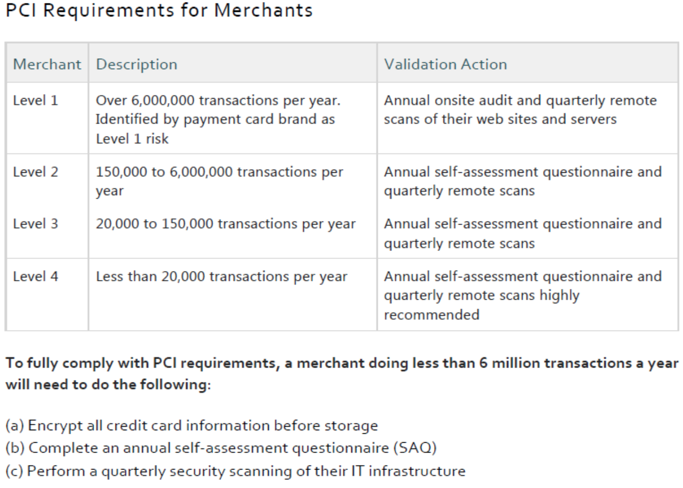 Merchant levels are determined by the merchant’s annual volume of transactions. Specific merchant levels can be defined using the table below: